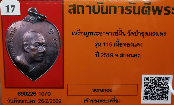 เหรียญพระอาจารย์ฝั้น วัดป่าอุดมสมพร รุ่น119(ตอกโค๊ต) เนื้อทองแดง ห่วงเดิม ปี2519 จ.สกลนคร + บัตรG-pra สภาพสวยเดิมค่ะ |