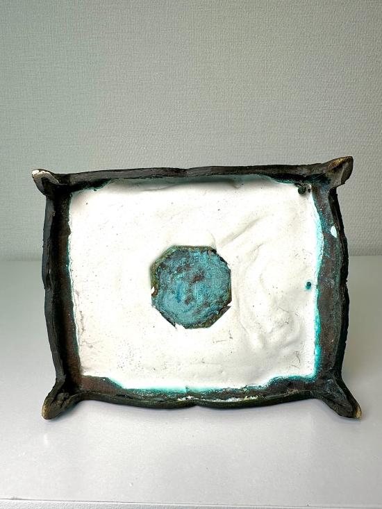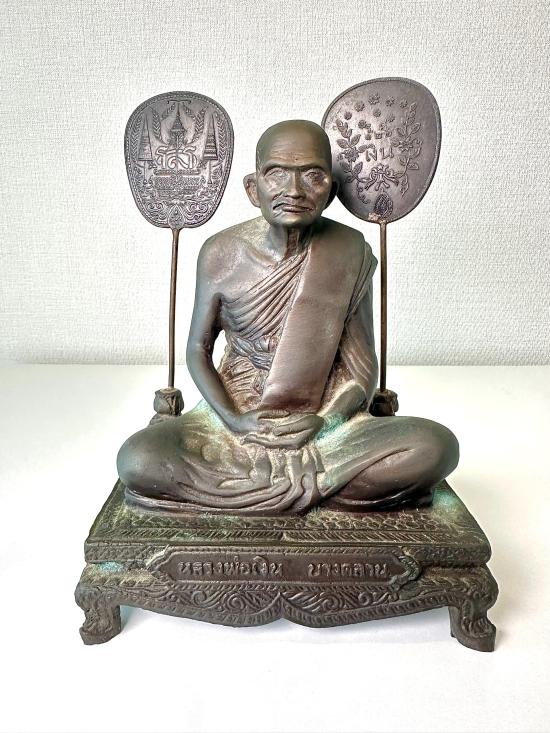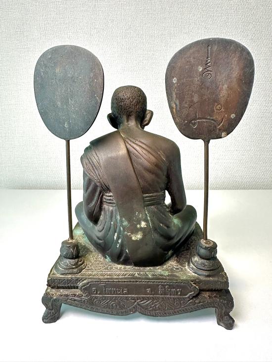 รูปเหมือนขนาดบูชาของหลวงพ่อองค์นี้ขนาดหน้าตัก 5 นิ้ว ด้านหลังประดับด้วยตาลปัตร 2 อัน พระมีอายุหล่อด้วยเนื้อทองผสมลมน้ำตาลแบบมันปูผิวหิ้งมีคราบความเก่า น่าบูชามากค่ะ |