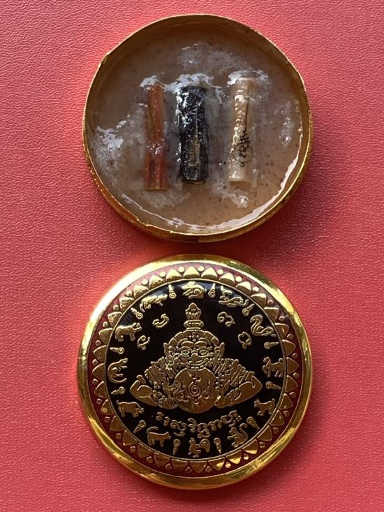 เคาะเดียวแดง สีผึ้งพระราหู รุ่น มงคลจักรวาล เนื้อ โลหะชุบทองลงยาสีดำขอบสีแดง ขนาด 5ซม |