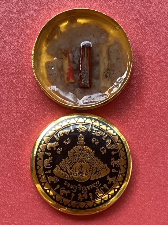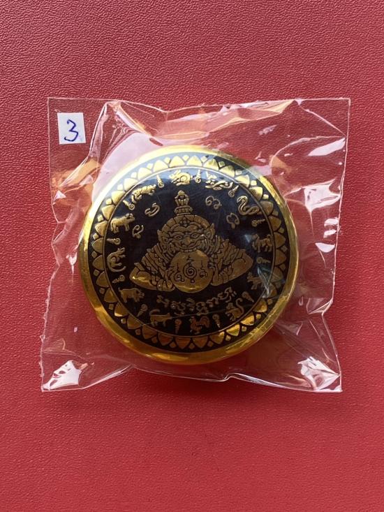 เคาะเดียวแดง สีผึ้งพระราหู รุ่น มงคลจักรวาล เนื้อ โลหะชุบทองลงยาสีดำขอบสีดำ ขนาด 5ซม |
