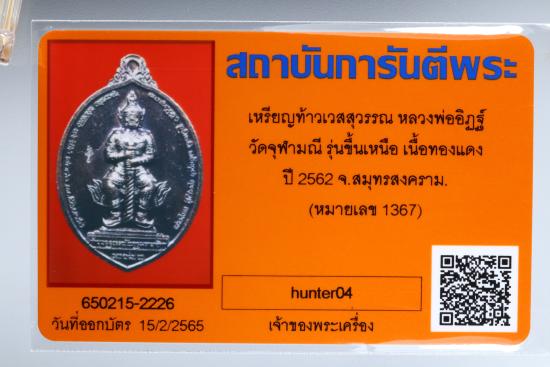 เหรียญท้าวเวสสุวรรณโณหลวงพ่ออิฏฐ์ วัดจุฬามณี พิมพ์ลูกท้อ รุ่นขึ้นเหนือ เนื้อทองแดง ปี2562 พร้อมกล่องเดิม |