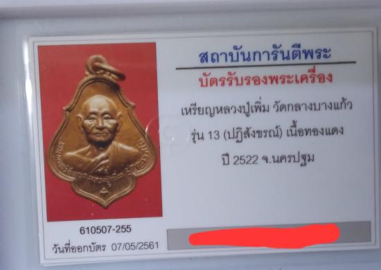 เหรียญหลวงปู่เพิ่มวัดกลางบางแก้วรุ่น 13 ปี 2522 เหรียญโชคดีเนื้อทองแดงผิวไฟพร้อมบัตรสถาบันการันตีรุ่นปฏิสังขรณ์ |