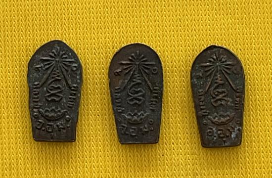 พระปรกใบมะขามหลวงปู่แหวนออกวัดสัมพันธวงค์ ปี 2520 เนื้อทองแดง 3 องค์ |