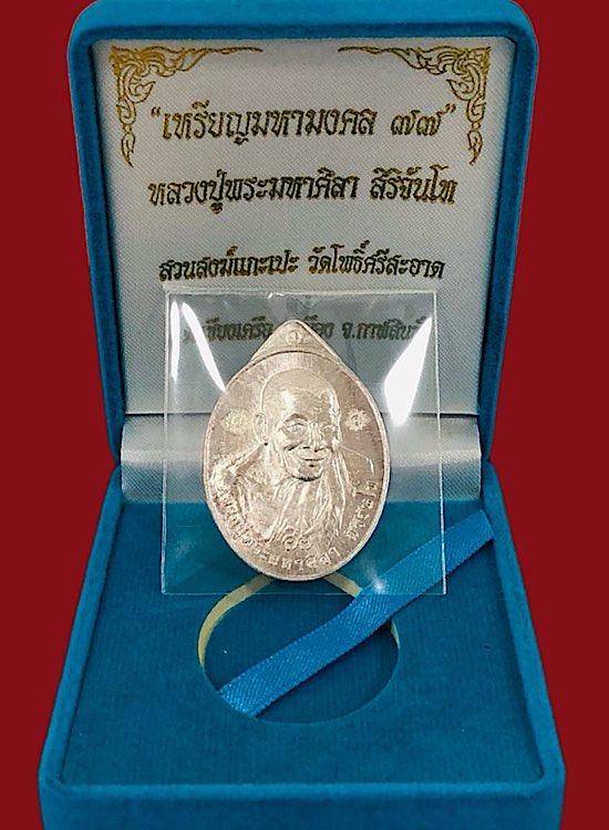 หลวงปู่มหาศิลา มหามงคล 77 ปี64 เนื้อเงินผิวกระจก จมูก100% เลข61 กล่องครบ ยุคต้นหายากแกะบล็อกสดโบารณ เหรียญจริงสวยมาก