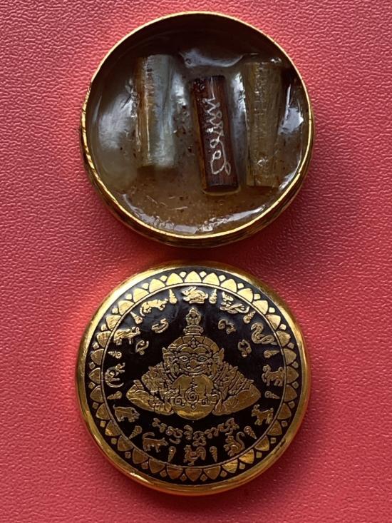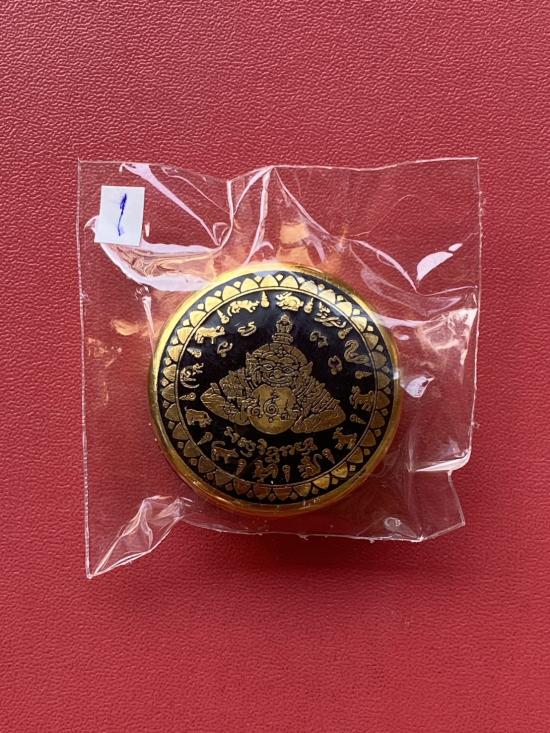 เคาะเดียวแดง สีผึ้งพระราหู รุ่น มงคลจักรวาล เนื้อ โลหะชุบทองลงยาสีดำขอบสีดำ ขนาด3.2ซม |