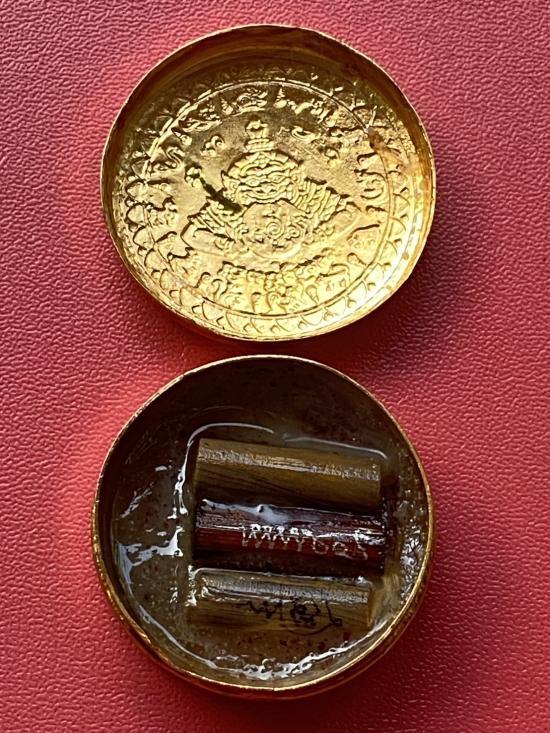 เคาะเดียวแดง สีผึ้งพระราหู รุ่น มงคลจักรวาล เนื้อ โลหะชุบทองลงยาสีดำขอบสีแดง ขนาด3.2ซม |