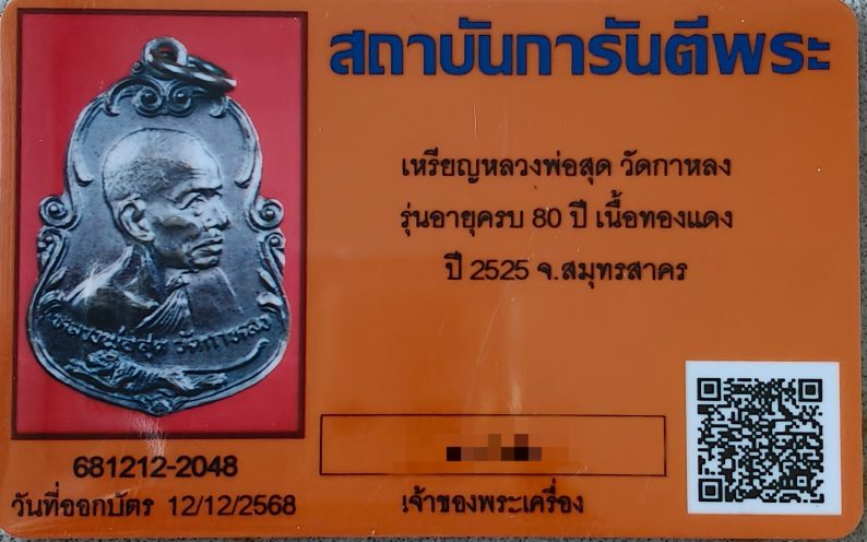 เหรียญหลวงพ่อสุด วัดกาหลง " พิมพ์น้ำเต้า บล็อคนิยมรางคู่ " เนื้อทองแดง ปี 2525 จ.สมุทรสาคร+บัตรรับรอง |