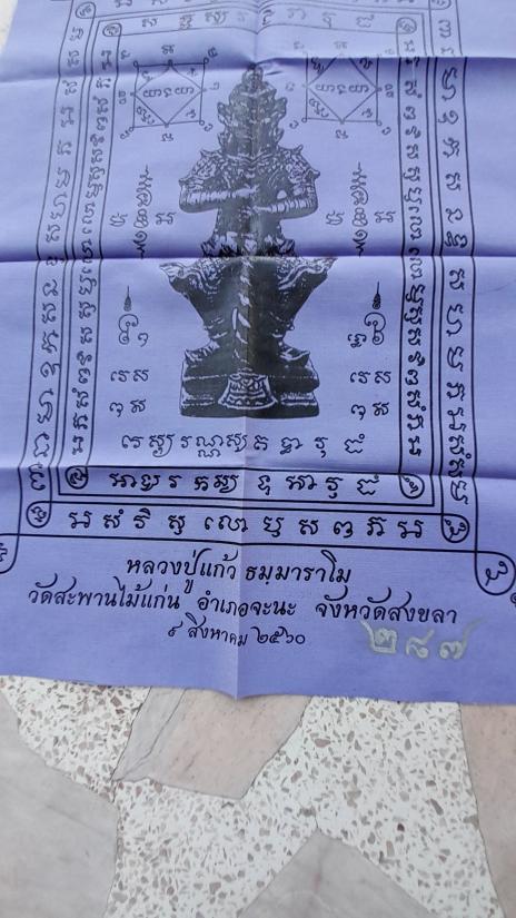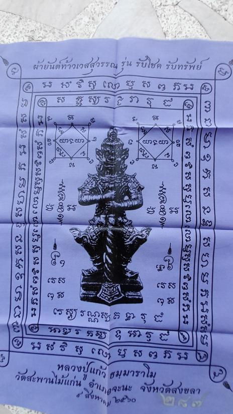 วัดใจเคาะเดียว.......100......ผ้ายันต์ท้าวเวสสุวรรณ รับโชค รับทรัพย์ สีม่วง เลข ๒๘๗ ขนาด 11.5 X 16.5 นิ้ว ปี 2560 หลวงปู่แก้ว วัดสะพานไม้แก่น จังหวัดสงขลา |