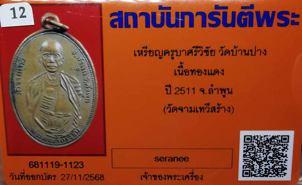 เหรียญครูบาศรีวิชัย วัดบ้านปาง เนื้อทองแดง ห่วงเดิม ปี2511 จ.ลำพูน(วัดจามเทวีสร้าง) + บัตรG-pra สภาพเดิมค่ะ |