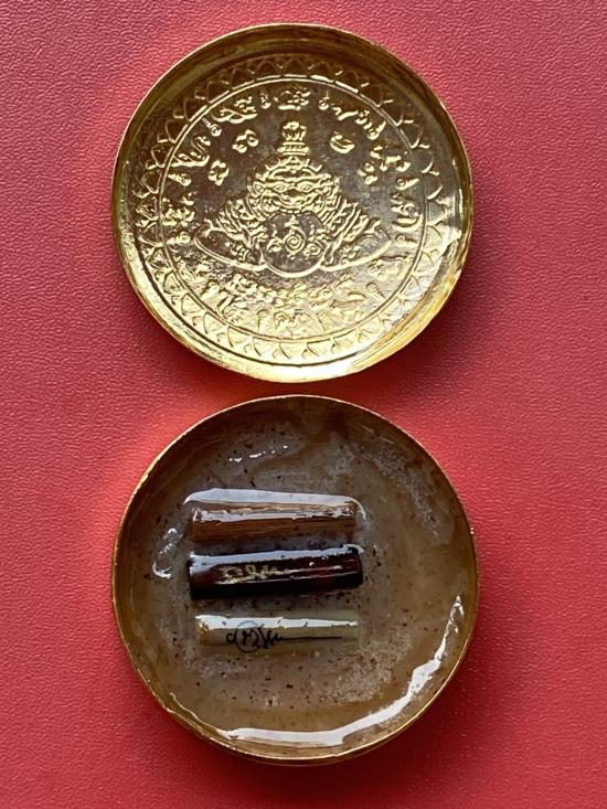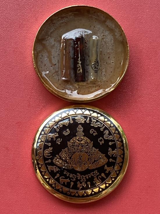 เคาะเดียวแดง สีผึ้งพระราหู รุ่น มงคลจักรวาล เนื้อ โลหะชุบทองลงยาสีดำขอบสีดำ ขนาด5ซม |