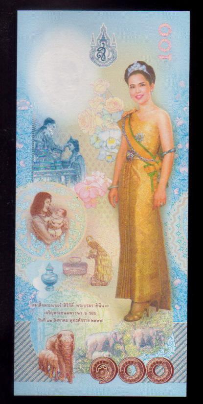 ## ธนบัตรที่ระลึก 100 บาท สมเด็จพระนางเจ้าพระบรมราชินีนาถในรัชกาลที่ 9 เฉลิมพระชนมพรรษาครบ 6 รอบ ## ไม่ผ่านการใช้ |