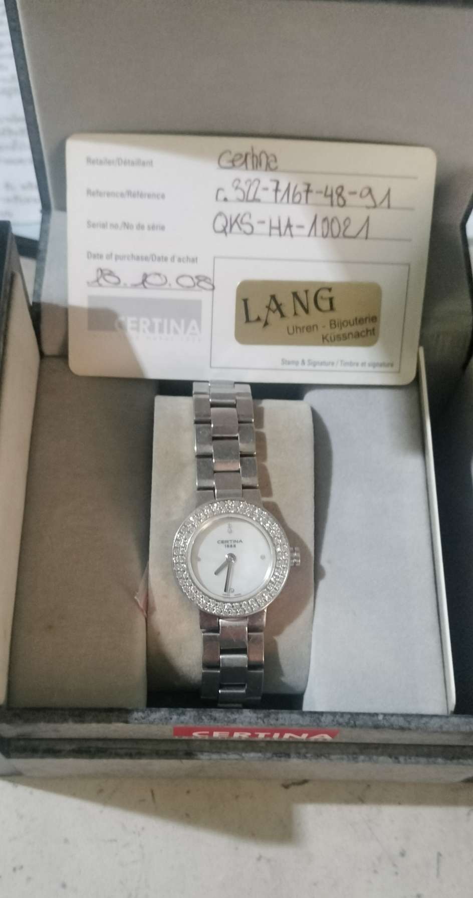 นาฬิกาสุภาพสตรี Certina รุ่น DS Escala Elipse ประดับเพชร มีใบรับประกันเพชรและตัวเรือนหรูหราึลาสสิคสไตล์สวิสแท้พร้อมกล่องเดิม มือสองสภาพสมบูรณ์ |