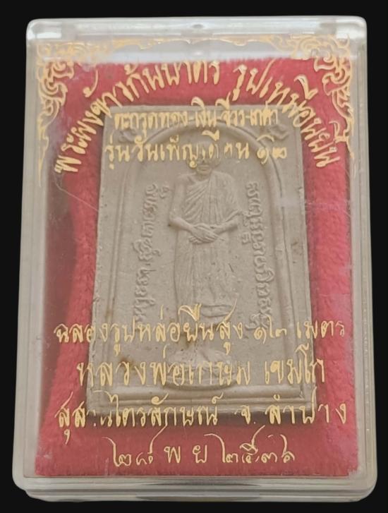 สร้างเพียง 2537 องค์ครับ พระผง ข้าวก้นบาตร รูปเหมือนยืน หลวงพ่อเกษม เขมโก รุ่นวันเพ็ญเดือนสิบสอง ปี2536 ฝังตะกรุดเงิน มีเกศา ด้านหลังโรยพลอยเสก ในพิมพ์ พระสวยมากๆมีกล่องเดิมครับ |