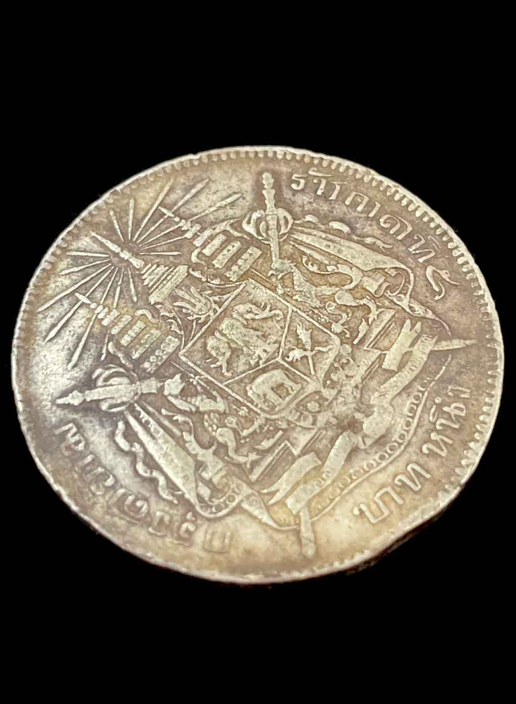 เหรียญเงิน บาทหนึ่ง รัชกาลที่ 5 หลังตราแผ่นดิน เนื้อเงิน น้ำหนัก 15 กรัม