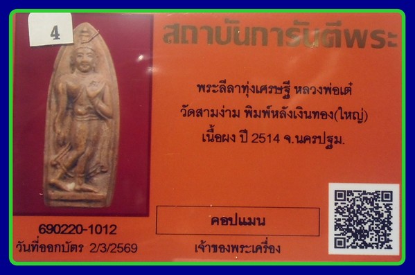 บัตรการันตี-700-พระลีลา หลังเงิน-ทอง เนื้อผงน้ำมัน พิมพ์ใหญ่ หลวงพ่อเต๋ วัดสามง่าม พศ.2514 |