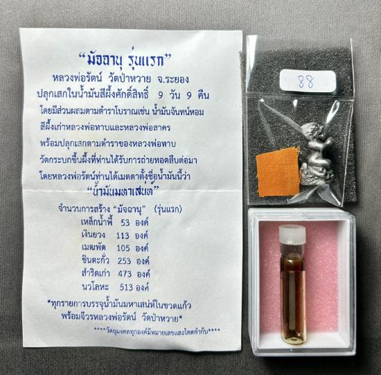 มัจฉานุรุ่นแรก หลวงพ่อรัตน์ วัดป่าหวาย "เนื้อชินตะกั่ว" เลขมงคลรวย "88" ปลุกเสกในน้ำมันสีผึ้ง (พร้อมน้ำมันสีผึ้งและจีวร) ครบสูตร |