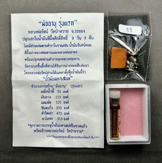 มัจฉานุรุ่นแรก หลวงพ่อรัตน์ วัดป่าหวาย "เนื้อเงินยวง" เลขมงคลรวย "88" ปลุกเสกในน้ำมันสีผึ้ง (พร้อมน้ำมันสีผึ้งและจีวร) ครบสูตร |