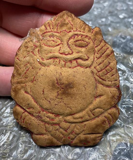 พระราหูอมจันทร์ ศิลปะสวย เป็นเนื้อผงคล้ายว่าน-ผงยาเป็นเสี้ยนๆ (ไม่ใช่ดิน) กดพิมพ์เป็นพระราหู สองแผ่นประกบกันครับ มีคราบชาดแดง แต่อาจหลุดเกือบหมดครับ