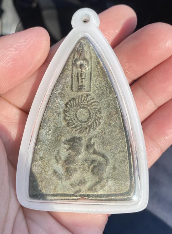 สามเหลี่ยม เป็นพระเก่าแก่ที่หาได้ยากมากๆ พิมพ์มีความคมชัด มีหน้ามีตา รอยปริ รอยระเบิดน้อยมาก เพราะเก็บรักษาอย่างดี.