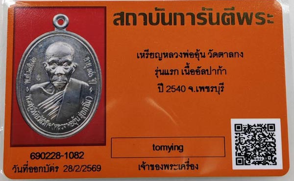 เหรียญรุ่นแรกหลวงพ่ออุ้น วัดตาลกง จ.เพชรบุรี เนื้ออัลปาก้า บล็อคหัวขีด นิยม พร้อมบัตรรับรอง