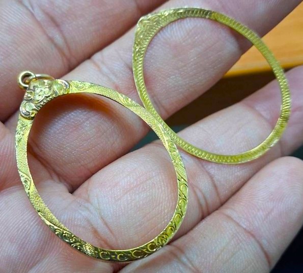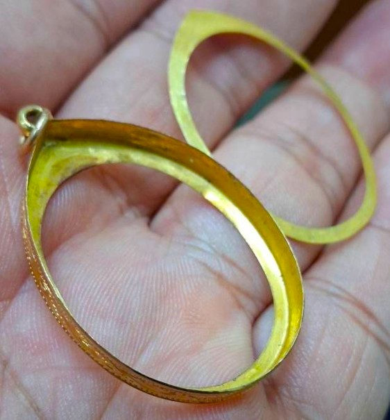 กรอบทองมือสอง ใส่เหรียญหลวงปู่ทวดรุ่น2,4 และเหรียญรูปไข่ทั่วไปที่ไกล้เคียง หน้าจอกว้าง 2.30 ซม., สูง 3.05 ซม. น้ำหนัก 1.70 กรัม เคาะเดียว