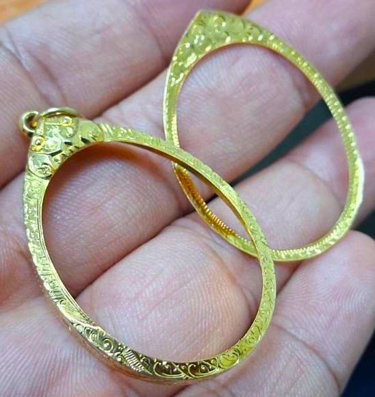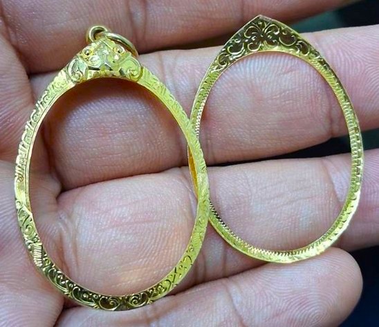 กรอบทองมือสอง ใส่เหรียญหลวงปู่ทวดรุ่น2,4 หลวงพ่อคูณ17 หลวงพ่อผาง12 หลวงปู่ทิมยายร้า และเหรียญรูปไข่ทั่วไปที่ไกล้เคียง หน้าจอกว้าง 2.40 ซม., สูง 3.10 ซม. น้ำหนัก 2.10 กรัม เคาะเดียว