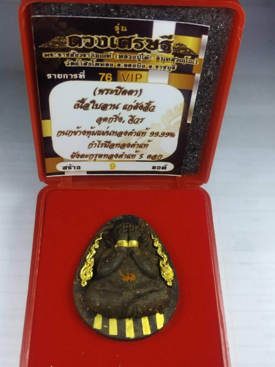พระปิดตา รุ่น ดวงเศรษฐี นำฤกษ์ หมายเลข 1 เนื้อใบลานแก่ตังอิ้ว อุดกริ่ง จีวร กนกข้างหุ้มแผ่นทองคำแท้ 99.99 เปอร์เซน กำไรมือทองคำแท้ ฝังตะกรุดทองคำแท้ 5 ดอก สร้าง 9 องค์ หลวงปู่โต๊ะ วัดถ้ำสิงโตทอง ราชบุ |