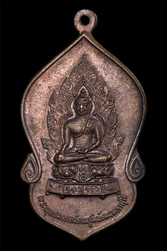 "พระพุทธมงคลรัตน์ภูมิพัฒนมหามุนี ภ.ป.ร." เหรียญ เนื้อทองแดง ปี 2523 พระบาทสมเด็จพระเจ้าอยู่หัวทรงพระกรุณาโปรดเกล้าพระราชทานนาม และ พระปรมาภิไธยย่อ ภ.ป.ร. ประดิษฐาน