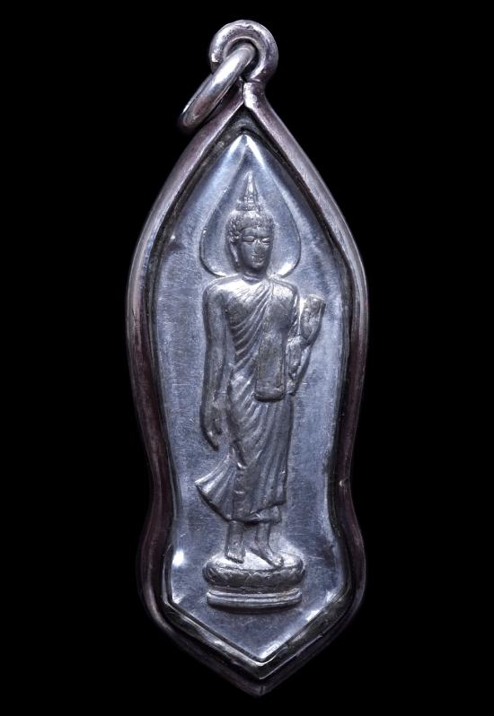 เหรียญพระลีลา 25 พุทธศตวรรษ เนื้อตะกั่ว ปี2500 บล็อคพระศกจุด เลี่ยมเงินผ่าหวาย แดงเคาะแรก