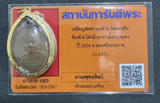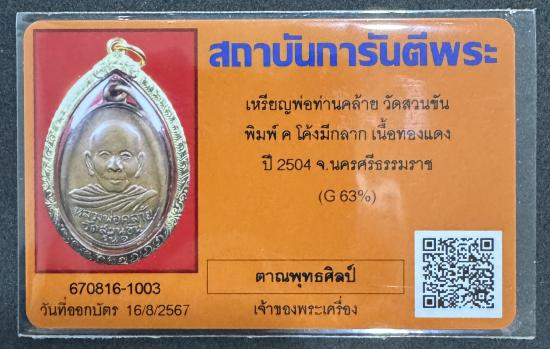 เหรียญพ่อท่านคล้าย วัดสวนขัน พิมพ์ ค โค้ง มีกลาก เนื้อทองแดง ปี 2504 จ.นครศรีธรรมราช