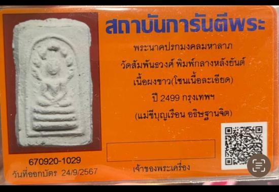 พระนาคปรกมงคลมหาลาภ พิมพ์กลางหลังยันต์ เนื้อผงขาว ออกวัดสัมพันธวงศ์ ปี 2499 คุณแม่บุญเรือนอธิษฐานจิต พร้อมบัตรรับรอง