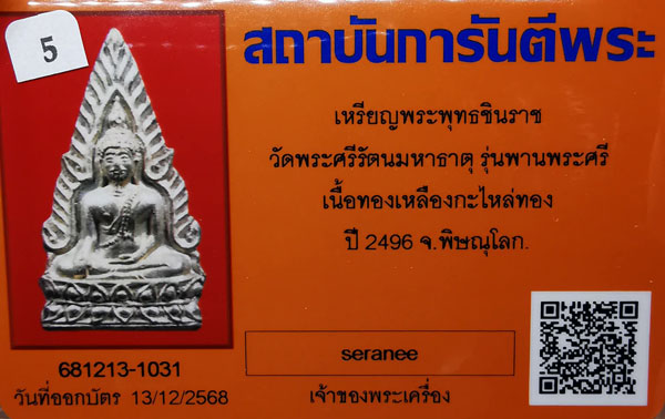 พระพุทธชินราช วัดพระศรีรัตนฯ รุ่นพานพระศรี เนื้อทองเหลืองกะไหล่ทอง ปี2496 จ.พิษณุโลก + บัตร G-pra สภาพเดิมค่ะ |