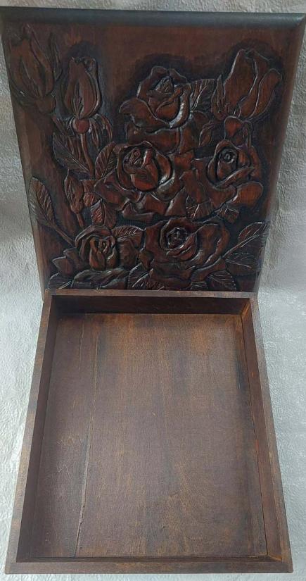 ***วัดใจ***กล่องไม้แกะสลัก วินเทจญี่ปุ่น งานฝีมือเก่า ลายกุหลาบ ขนาด 11 X 13 นิ้ว ใบใหญ่ไม้หนาๆ หนา 3 นิ้ว |