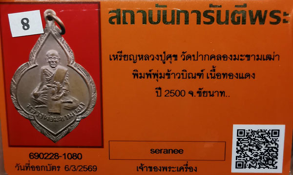เหรียญหลวงปู่ศุข วัดปากคลองมะขามเฒ่า เนื้อทองแดง ห่วงเดิม ปี2500 จ.ชัยนาท+ บัตรG-pra สภาพสวยเดิมค่ะ |