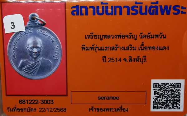 เหรียญหลวงพ่อจรัญ วัดอัมพวัน รุ่นแรกพิมพ์สร้างเเสริม เนื้อทองแดง ห่วงเดิม ปี2514 จ.สิงห์บุรี + บัตรG-pra สภาพสวยเดิมค่ะ |