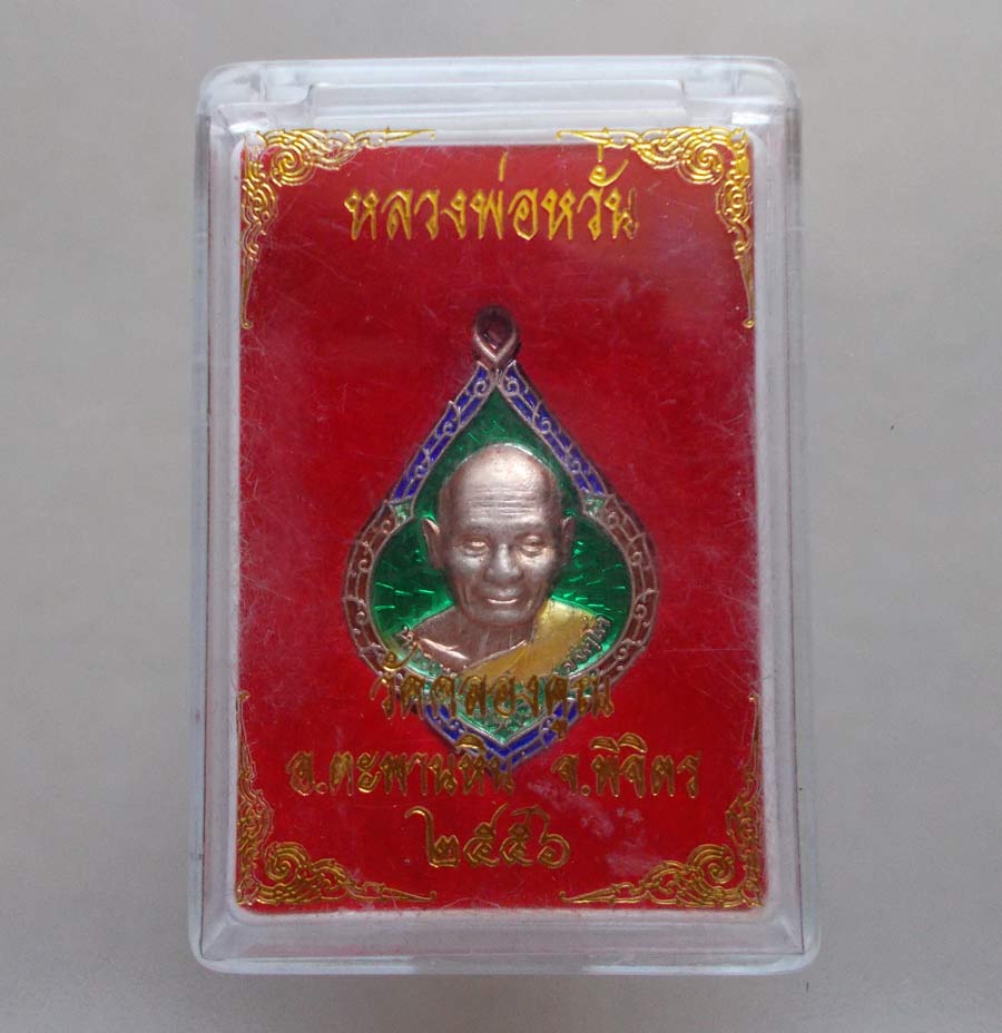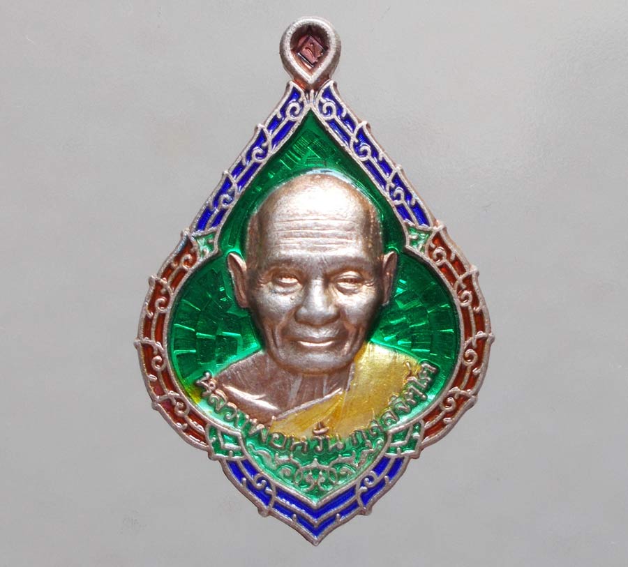 เหรียญใบสาเก หลวงพ่อหวั่น กุศลจิตฺโต วัดคลองคูณ พ.ศ.2556 เนื้อเงินลงยา 4 สี ( พึ้นสีเขียว ) ตอก 2 โค๊ต ตอกเลข กล่องครบ !! |