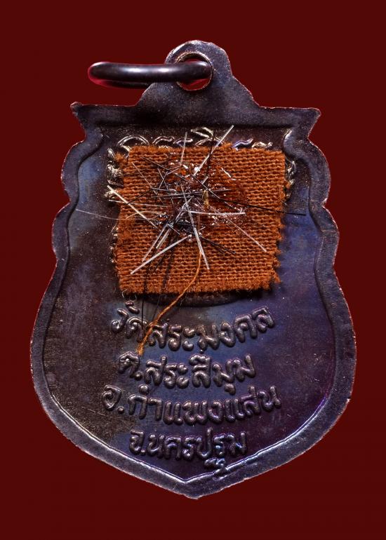 เหรียญเสมา รุ่นแรก หลวงปู่มหาเจิม วัดสระมงคล จ.นครปฐม เนื้อทองแดง ด้านหลังติดจีวร+เกศา ปี 2549 แดงเคาะแรก