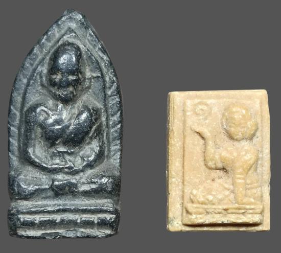 พระรูปเหมือนเนื้อดำ+แม่นางกวักผงน้ำมันไม่ทราบที่คับ |