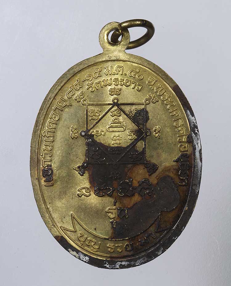 เหรียญหลวงปู่ทิม วัดพระขาว ปี 2540 ด้านหน้าเป็นรูปเหมือนหลวงปู่ทิมนั่งเต็มองค์ ด้านบนเขียนว่า "พระครูสังวรสมณกิจ (หลวงปู่ทิม อตฺตสนฺโต) ด้านล่างเขียนว่า "รุ่นแรก" ส่วนด้านหลังส่วนบนเขียนว่า "แจกวันเกิดอายุ ๘๔-๑๕ ม.ค.๔๐วัดพระขาว จ.พระนครศรีอยุธยา" ตรงกลางมียันต์ ด้านล่างเขียนว่า "รุ่นบุญรวยมา" จุด สังเกตของเหรียญรุ่นนี้ จัดสร้างเนื้อกะไหล่ทองเพียงเนื้อเดียว มีทั้งตอกโค้ดด้านหน้า 2 ตัว และแบบไม่มีโค้ด เป็นเหรียญที่แกะพิมพ์ตื้นมาก เพื่อป้องกันการปลอม ตอกโค๊ดสองตัว. (เหรียญรุ่นนี้ เป็นรุ่นแรกของคุณ บุญมา บุญเลิศวณิชย์ ที่สร้างถวายหลวงปู่ทิมครับ)