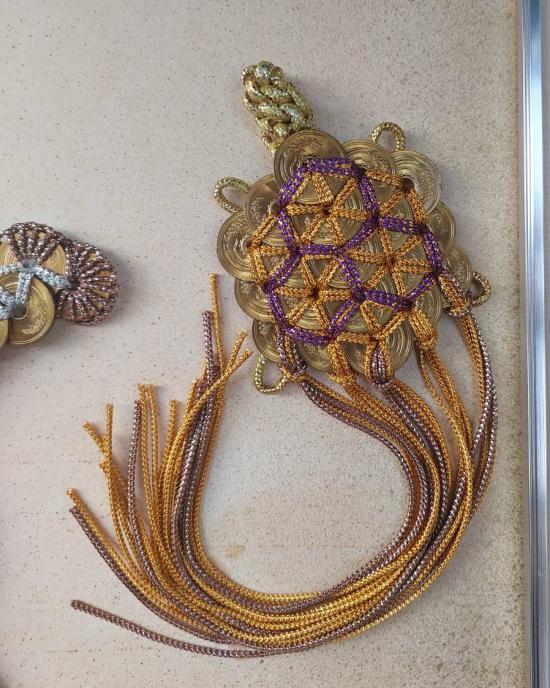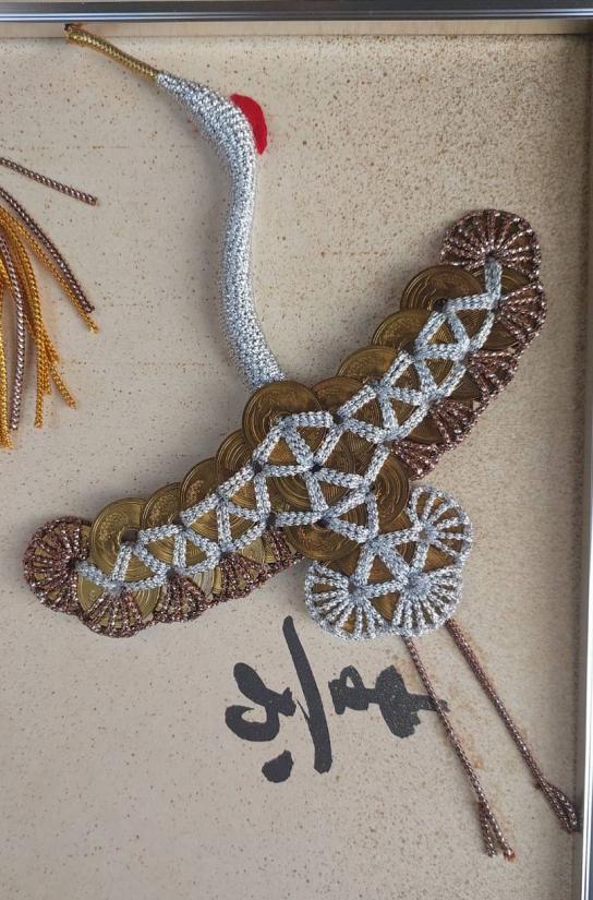 เหรียญ 5 เยน ทำเป็นเครื่องรางนำโชค งานฝีมือแบบญี่ปุ่นดั้งเดิม โดยมีนกกระเรียน (สึรุ) และเต่า (คาเมะ) ซึ่งเป็นสัญลักษณ์ของอายุยืนยาวและความโชคดี