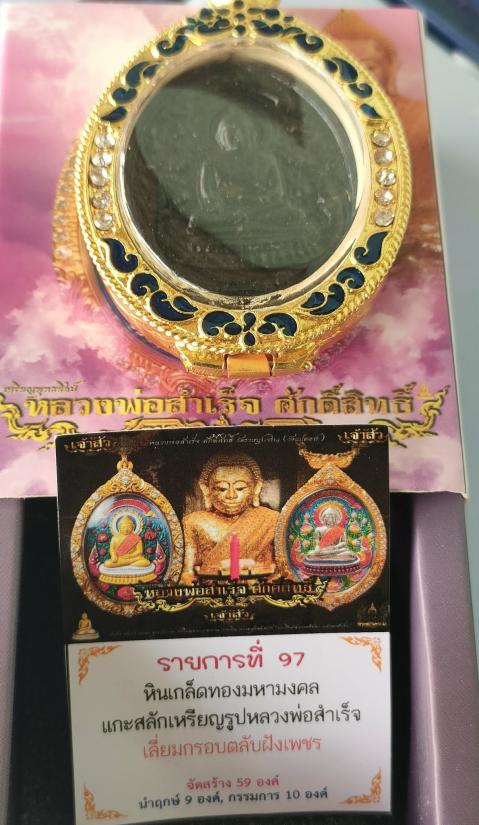 เหรียญพุทธศิลป์ หลวงพ่อสำเร็จศักดิ์สิทธิ์รุ่น"เจ้าสัวยุค๙" บ้านหนองตาโล่ จ.สระบุรี เนื้อหินเกล็ดทองมหามงคล แกะสลักเหรียญรูปหลวงพ่อสำเร็จ เลี่ยมกรอบตลับฝังเพชร หมายเลข ๒๐ พร้อมกล่อง เหรียญแรไอแทม |