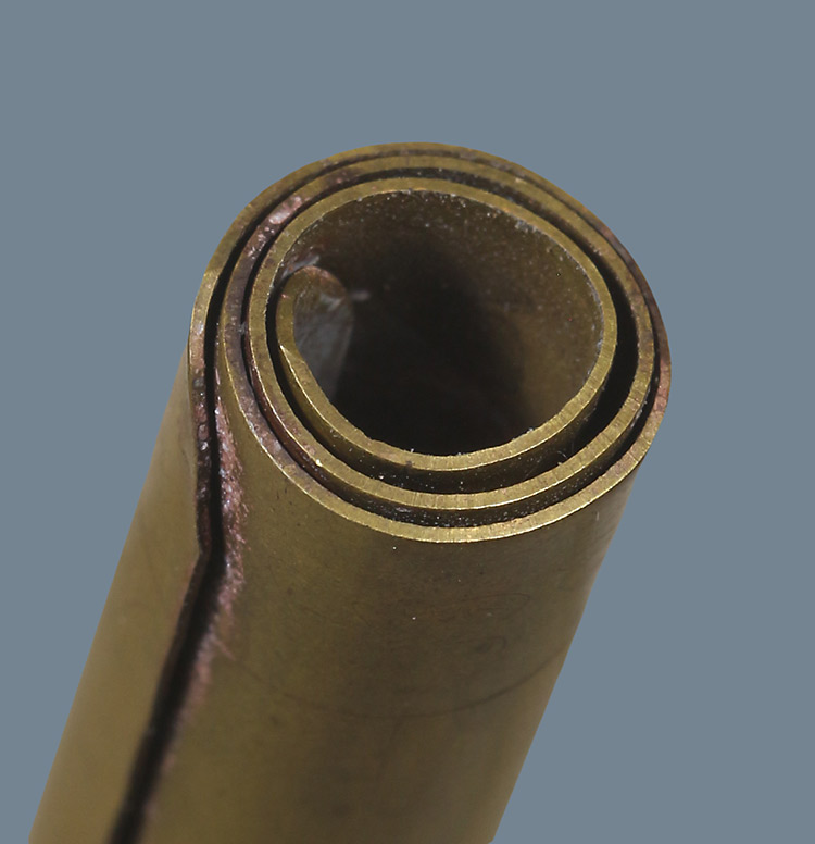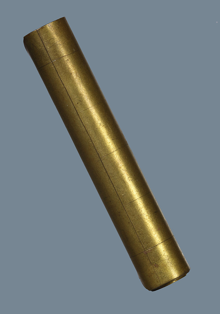 วัดใจ**เครื่องราง ตะกรุดเนื้อฝาบาตรเก่า*{ มีรอยจารนอกจารใน }*ยาว 2.นิ้ว ไม่ทราบที่....เดิมๆครับ