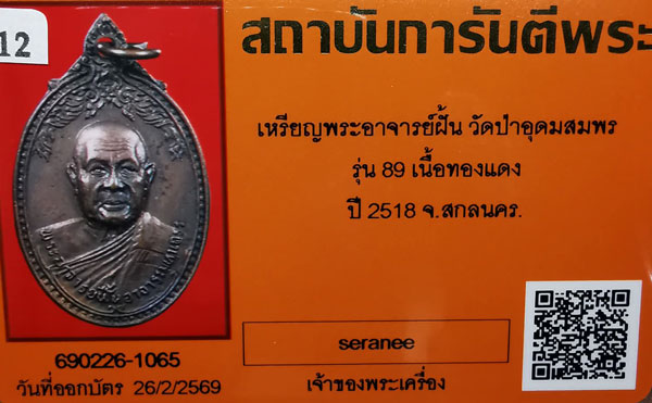 เหรียญพระอาจารย์ฝั้น วัดป่าอุดมสมพร รุ่น89 เนื้อทองแดง ห่วงเดิม ปี2518 จ.สกลนคร + บัตรG-pra สภาพเดิมค่ะ |