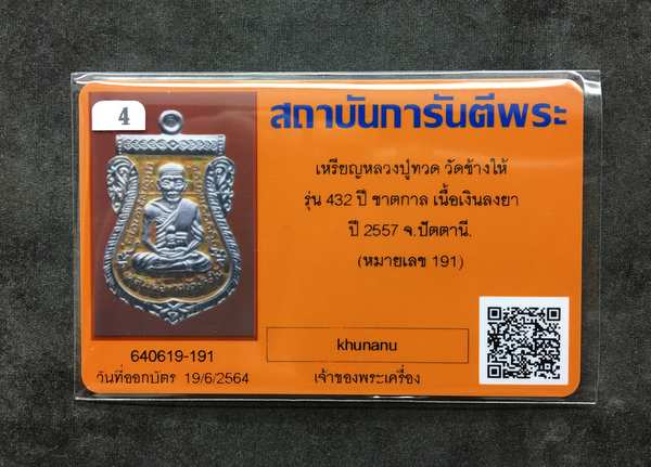 วัดใจ**เหรียญเสมาหลวงพ่อทวด หลังอาจารย์ทิม วัดช้างให้ พิมพ์หน้าเลื่อน โบราณย้อนยุค รุ่น ๔๓๒ ปี ชาตกาล หลวงพ่อทวด เนื้อเงินลงยาราชาวดีสีเหลือง หมายเลข 191 เลียมกันน้ำอย่างดี ไม่มีกล่อง