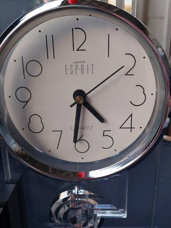 นาฬิกาตั้งโต๊ะของแบรนด์แฟชั่น ESPRIT ซึ่งเป็นรุ่นลิมิเต็ดอิดิชั่นที่มีตัวเรือนเป็นอะคริลิกใสและมาพร้อมกับลูกตุ้มแกว่ง โดยนาฬิกาประเภทนี้มักเป็นของสะสมที่ได้รับความนิยมสำหรับผู้ที่ชื่นชอบงานดีไซน์ยุค 90.