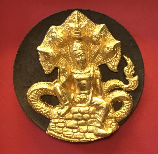 ...ด้านหน้าเป็นเทวะประติมากรรมแบบนูนสูง องค์พระเทวโพธิสัตว์จตุคามรามเทพ ศิลปะสมัยศรีวิชัยอันงดงาม ประทับบนบัลลังก์ศิลาแลงห้อยพระบาท ปางลีลาประทานพร พญานาคราชปรก ๕ เศียรอันวิจิตรบรรจง นับได้ว่าเป็นรูปแบบงานเทวประติมากรรมอันทรงคุณค่าชิ้นหนึ่งในสายผู้บูชาสะสม องค์จตุคามรามเทพ