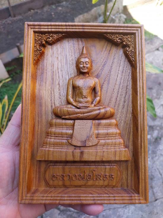 หลวงพ่อโสธร ไม้สักแกะสลักมงคล. กว้าง 14 ซม สูง 20 ซม. หนา 2 .5 ซม + ขาตั้ง |