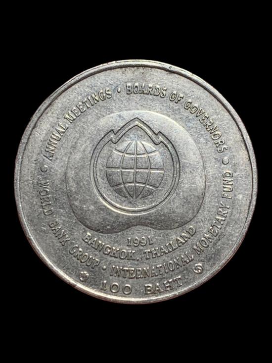 เหรียญ 100 บาท ที่ระลึกการประชุมสภาผู้ว่าการธนาคารโลกและกองทุนการเงินระหว่างประเทศ |