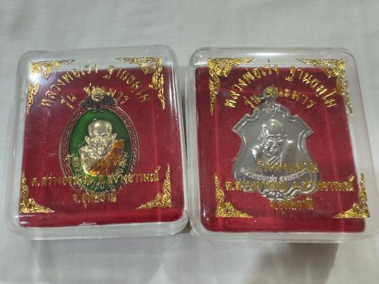 เหรียญชนะมาร ทรงไข่ลงยาสีเขียว และทรงอาร์ม หลวงพ่อเร่ง ฐานธมโม วัดดงแขวน จังหวัดอุทัยธานี จำนวน 2เหรียญ |