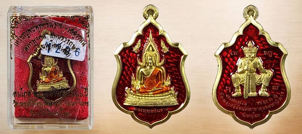เหรียญโล่ห์พระพุทธชินราช หลังยันต์วิเศษอกเลาโภคทรัพย์ เนื้อทองทิพย์ลงยาสีแดง รุ่น สมโภชพระพุทธชินราช ครบ ๖๖๖ ปี